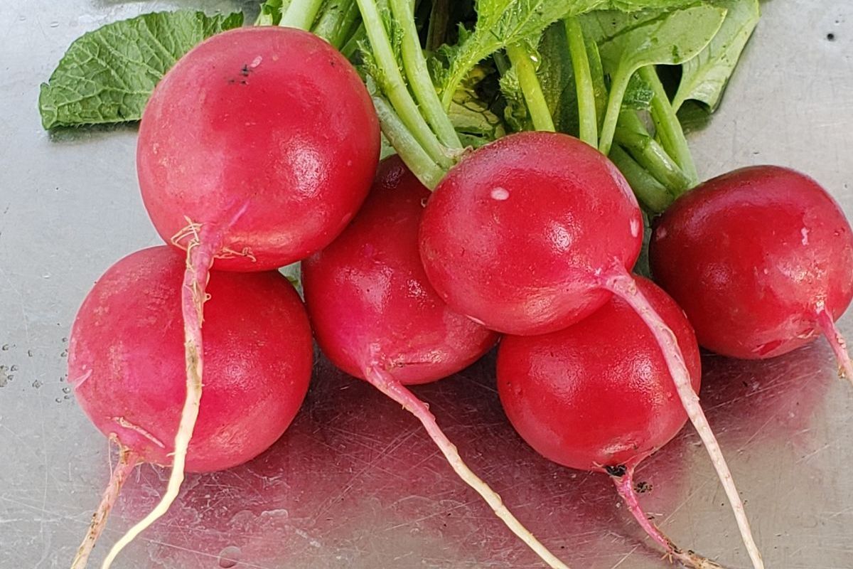Traditional round red radishes have a peppery flavor and crisp nature well suited for fresh and cooked preparations. The radishes can be sliced and displayed on charcuterie plates, chopped and tossed into salads, sliced thin and served with dips, or shredded into slaws.