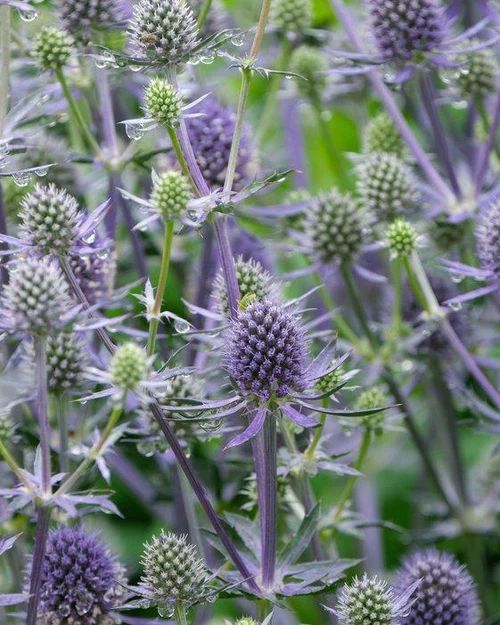Striking, thistle-like, metallic blue or white flower heads.