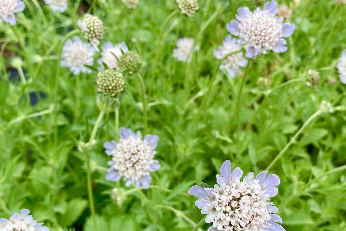 Round, single, 2-3 inch flowers with overlapping papery petals. They are named pincushion flowers due to their stamens that emerge from the small, round blooms, resembling pins in a pincushion. These flowers come in various colors, including blue, lavender, white, and pink. 10 stems bunch.
