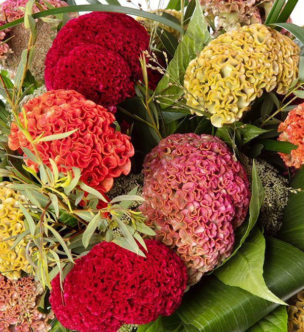 Vibrant and distinctive flower heads. These annual plants come in various forms, including the plumed (feather-like) and cockscomb (velvet-textured, brain-like) types, and are popular for their long-lasting blooms. 10 stems bunch.