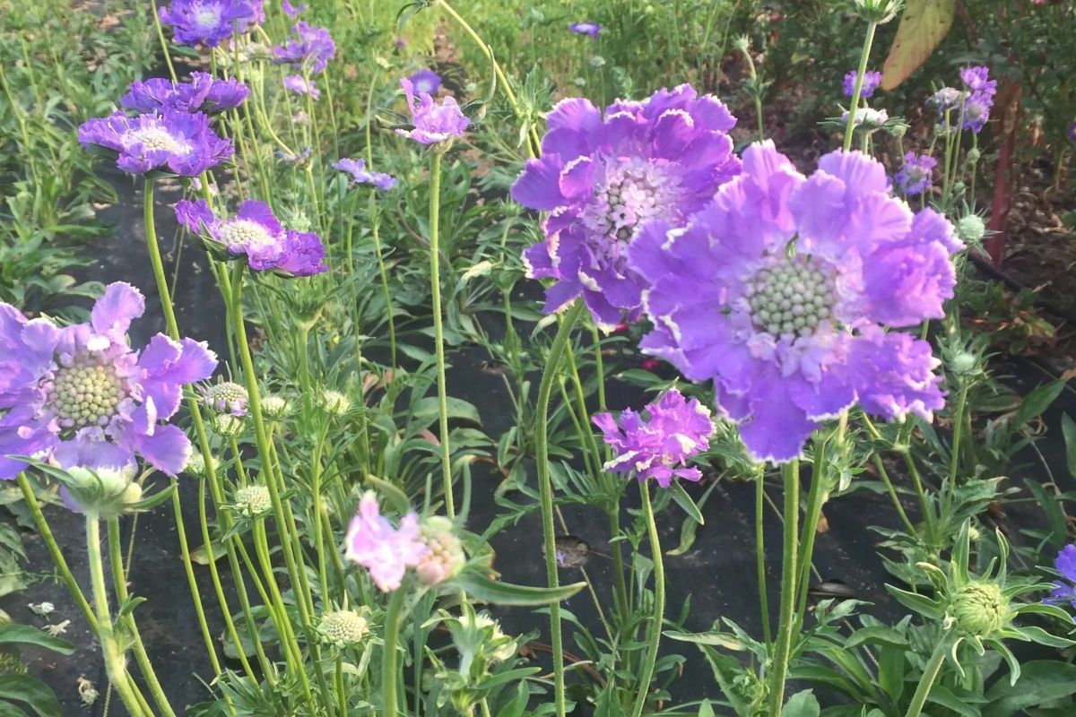 Round, single, 2-3 inch flowers with overlapping papery petals. They are named pincushion flowers due to their stamens that emerge from the small, round blooms, resembling pins in a pincushion. These flowers come in various colors, including blue, lavender, white, and pink. 10 stems bunch.