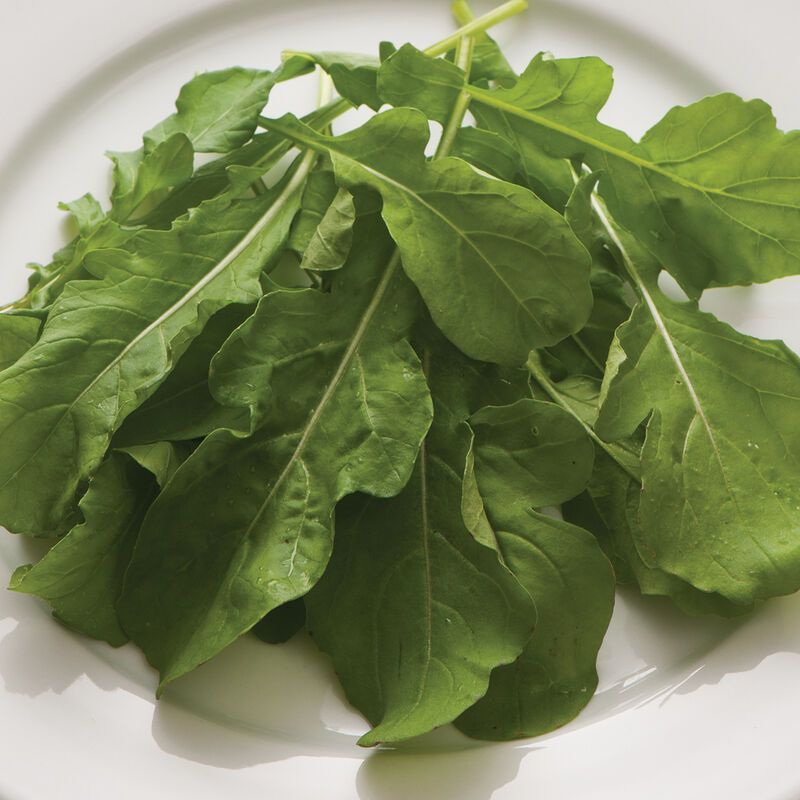 Arugula. Its taste is peppery and a little nutty. Lovers of arugula are fanatics about it and will eat it with everything from salad to pizza.