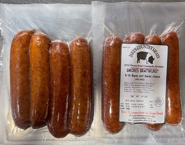 Introducing the savory sensation of Jake's Smoked Bacon Cheese Brats, where premium pastured pork, smoky bacon, and creamy cheese unite to deliver a mouthwatering taste experience in every bite.