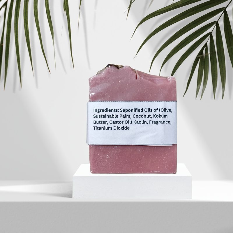 Ingredients: Saponified Oils of (Olive, Sustainable Palm, Coconut, Kokum Butter, Castor Oil), Kaolin, Fragrance, Titanium Dioxide, Rose