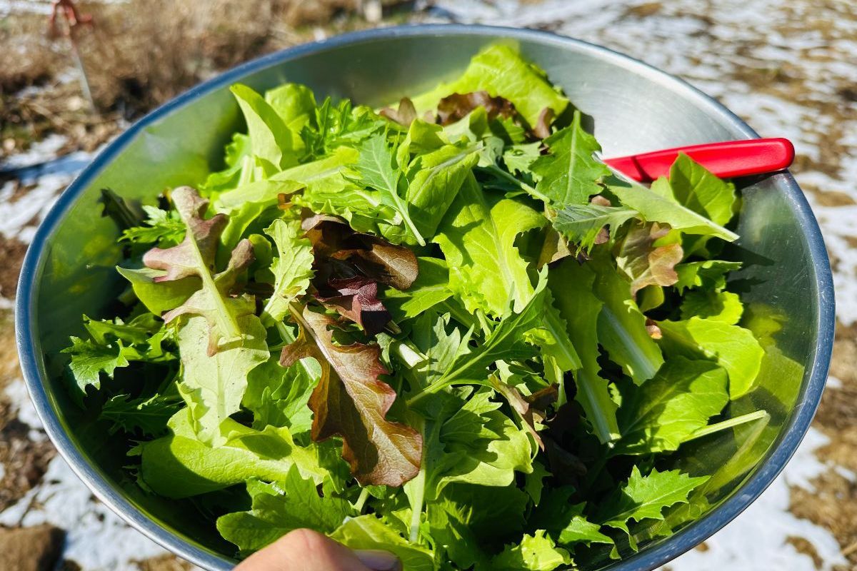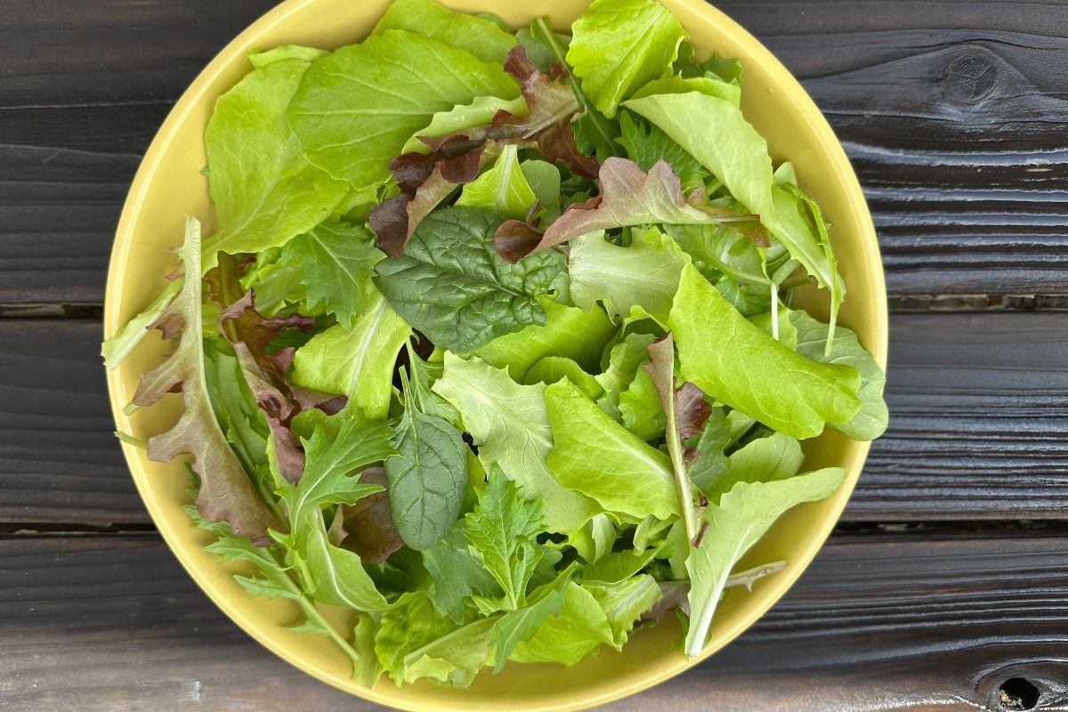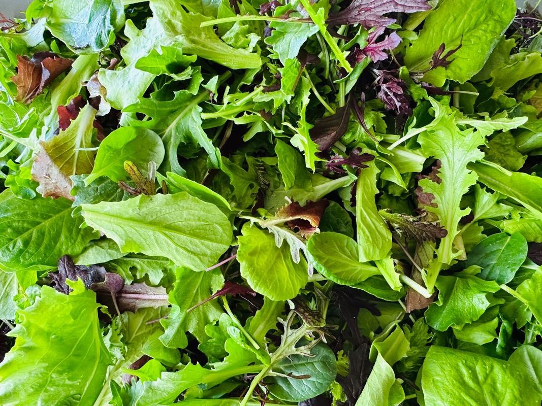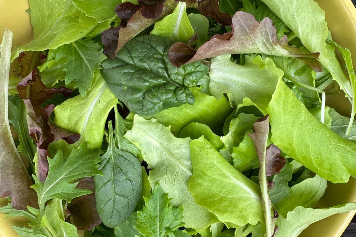 A mix of red and green leaf lettuce, Asian greens, and mustards