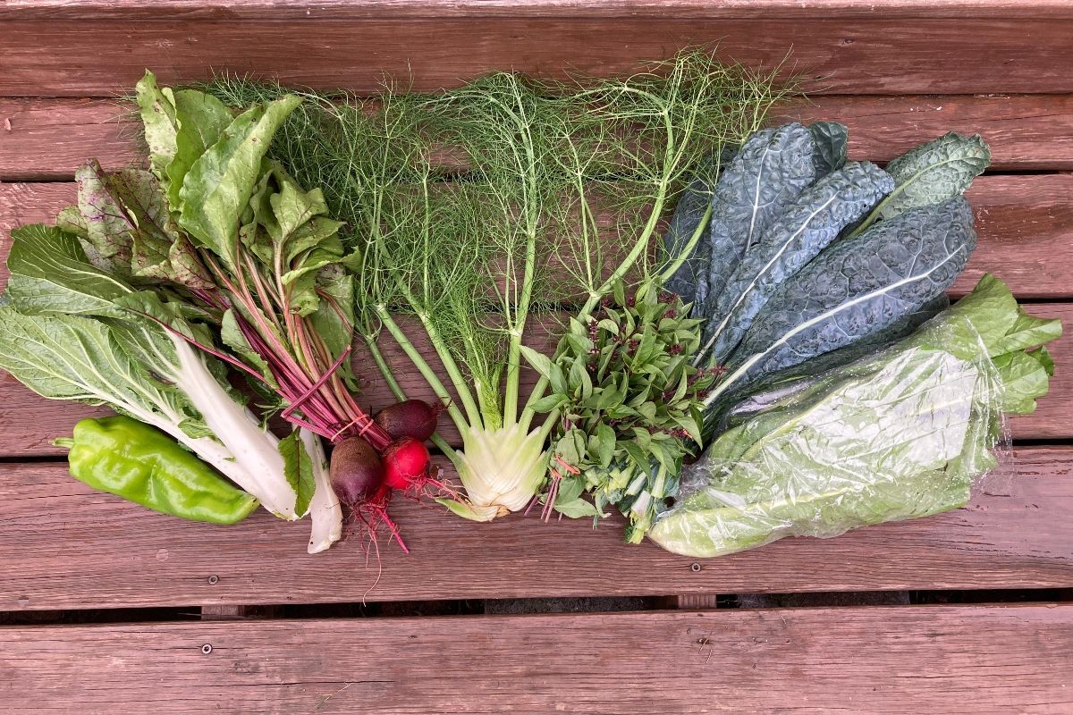 This is our farmer curated selection of vegetables. Your pick-up location will be chosen at checkout. Box content changes throughout the season from lettuce and greens to tomatoes and peppers. 6-8 items in total. Every week we try to offer: something green (lettuce, arugula), a root crop, tomatoes, peppers, and a special crop (kohlrabi, eggplant, watermelon radish, peaches). We also source locally some crops we don't grow.