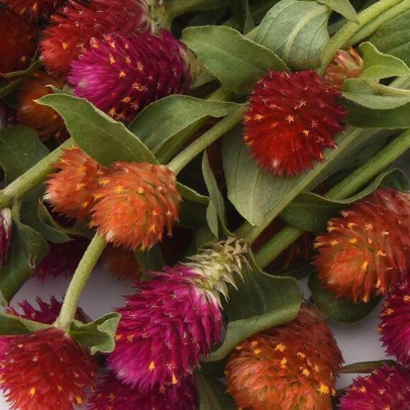 Gomphrena, or globe amaranth, is a heat loving flower. This variety is called "Strawberry Fields" and will grow to about 2 feet tall. These plants start slow but take off once the summer heat picks up. The blooms are fantastic either fresh or dried and attract some of the garden's smaller pollinators. The color makes it a perfect fall crafting addition for anyone who prefers working with natural materials.