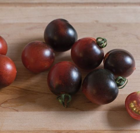 This cherry tomato is new to us this year but is said to have a vigorous growth habit and striking coloring. The fruit have an excellent sweet flavor.