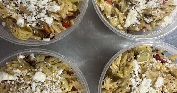 Orzo pasta with roasted peppers and onions, artichokes, and feta cheese tossed with our own lemon tarragon dressing.