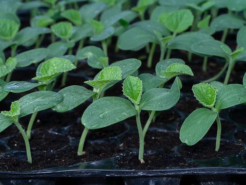 Thriving organic cantaloupe seedlings.
