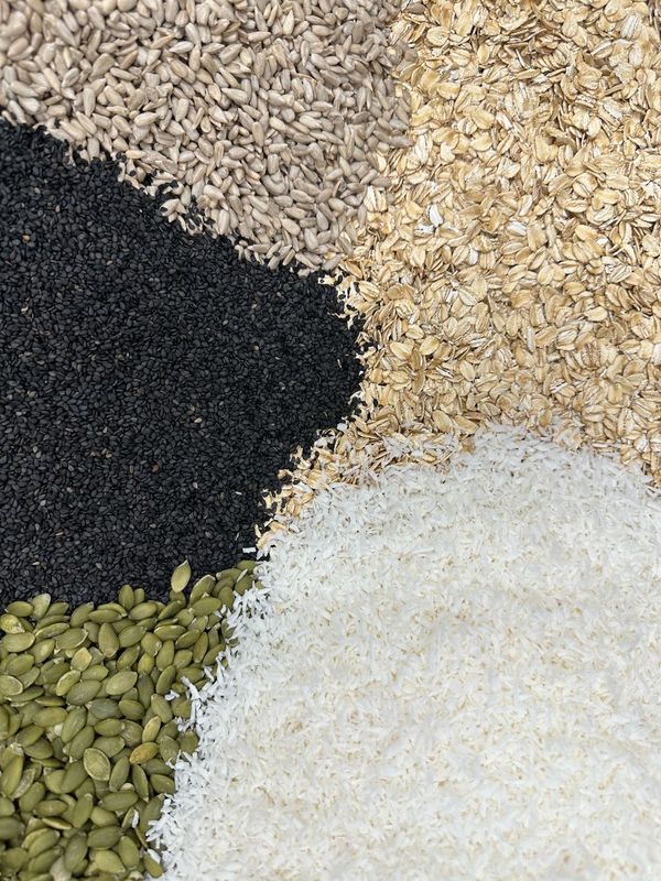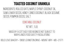 Baked low and slow until crisp and golden. Rolled oats, sunflower seeds, pumpkin seeds, black sesame, and dried coconut come together with maple syrup, honey, and coconut oil for a warm, toasty flavor. It’s crunchy, lightly sweet, and perfect for yogurt, fruit, or straight from the bag. Vegan and gluten-free.