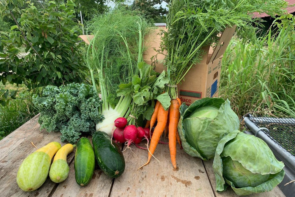 We often get asked how much food is in the CSA. We will include 6-10 items each week. Our goal is for each box to include: fresh greens, like salad mix or arugula, cooking greens, like kale or collards, root vegetables (carrots, beets, radishes, turnips, etc.), alliums and/or herbs (garlic, onions, cilantro, dill), hearty vegetables (squash, potatoes, sweet potatoes, etc.), and fresh, fun veggies, like tomatoes, cucumbers, peppers, peas. We find that it is enough food for 2 adults who cook at home often or a larger family that cooks vegetables as side dishes.