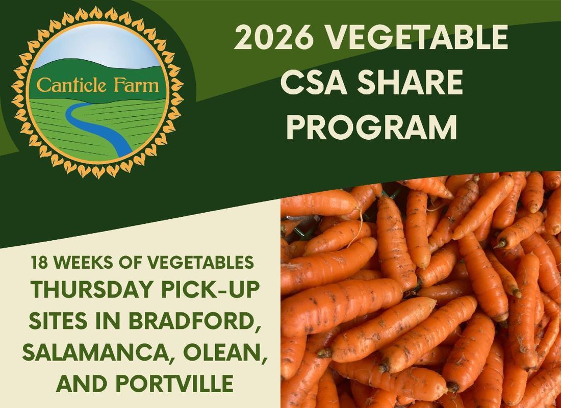 Our 2026 CSA program for off-farm pickup will run on Thursdays, from June 18 through October 15. We will coordinate deliveries to a host porch in Bradford, Olean, Portville, and Salamanca. In order to do each host porch, we need ten households per location. We will need one CSA member to offer to host the share deliver on their porch, and one CSA member to commit to picking up the shares each week for a $150 discount on their share price. Please contact us at office@canticlefarm.org if you are interested in either or both CSA member roles. Members will be able to choose their vegetables each week and place their order online through GrownBy.