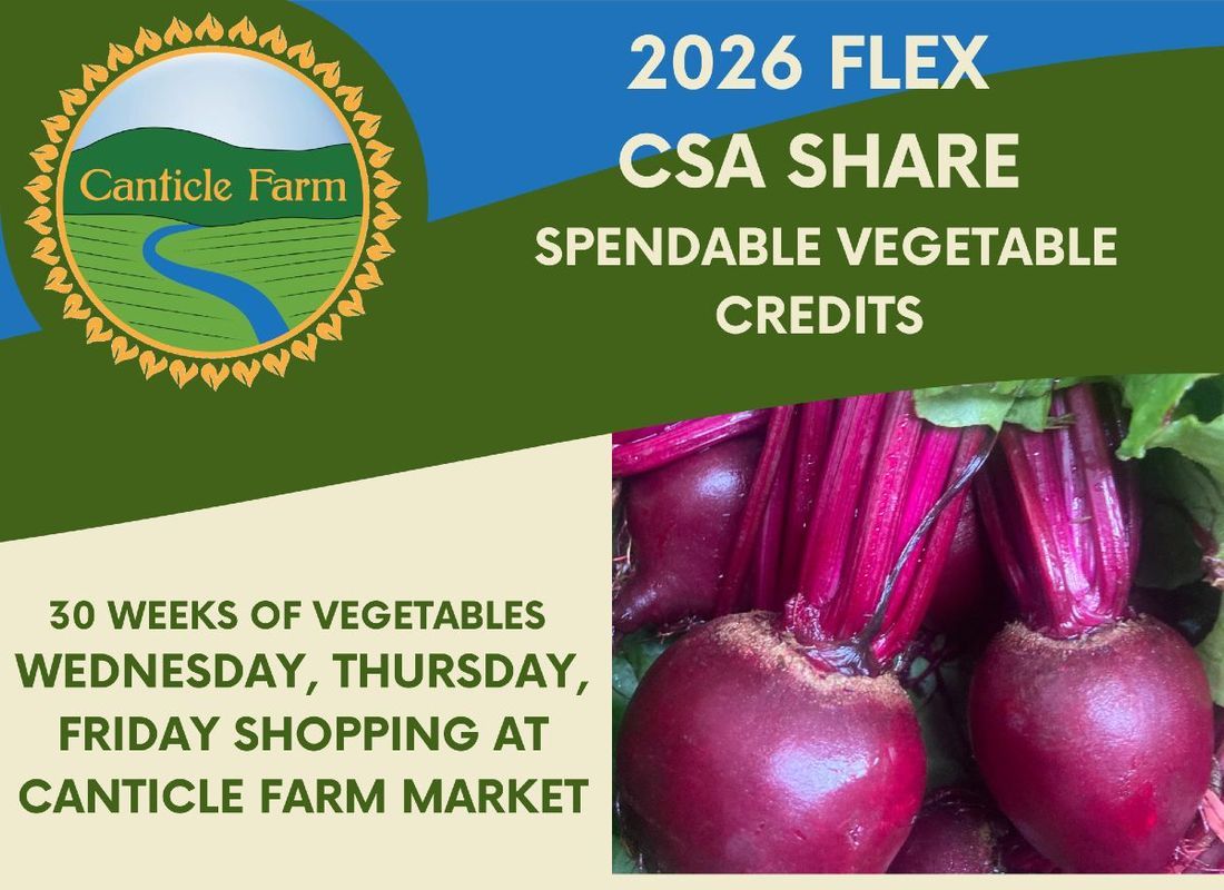 *If you need a payment plan for this share, please email us and we will set up 3 custom invoices through April 29. * Our 2026 Flex CSA program will run from April 29 through November 25. Members of the Flex CSA pay for a vegetable credit that they can debit from each time they wish to make a vegetable purchase. Flex CSA members can pick up produce on Wednesdays, Thursdays, and Fridays. All CSA members, both standard and flex, have the option to place orders online through GrownBy. This allows them to reserve vegetables that are in high demand, such as lettuce mix and cherry tomatoes. Flex CSA members have freedom to choose which weeks they want to buy produce, and how many items to buy each time. This share is perfect for those who travel often during the summer, are more likely to cook at different times of the growing season, have a varying household size throughout the season, or prefer the spring/fall vegetables over the summer vegetables. All Flex CSA vegetable credits remaining after Nov. 25 will be donated to the Canticle Farm Franciscan Food Pantry Program.