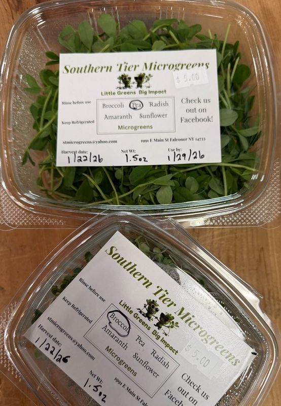 A fresh 1.5 ounce serving of Pea, Broccoli, or Radish microgreens from Southern Tier Microgreens! Each option gives you a vibrant, nutrient-dense boost, making it easy to enjoy something crisp, healthy, and delicious in your meals every week. You may add more than one share to both your spring CSA and summer CSA.