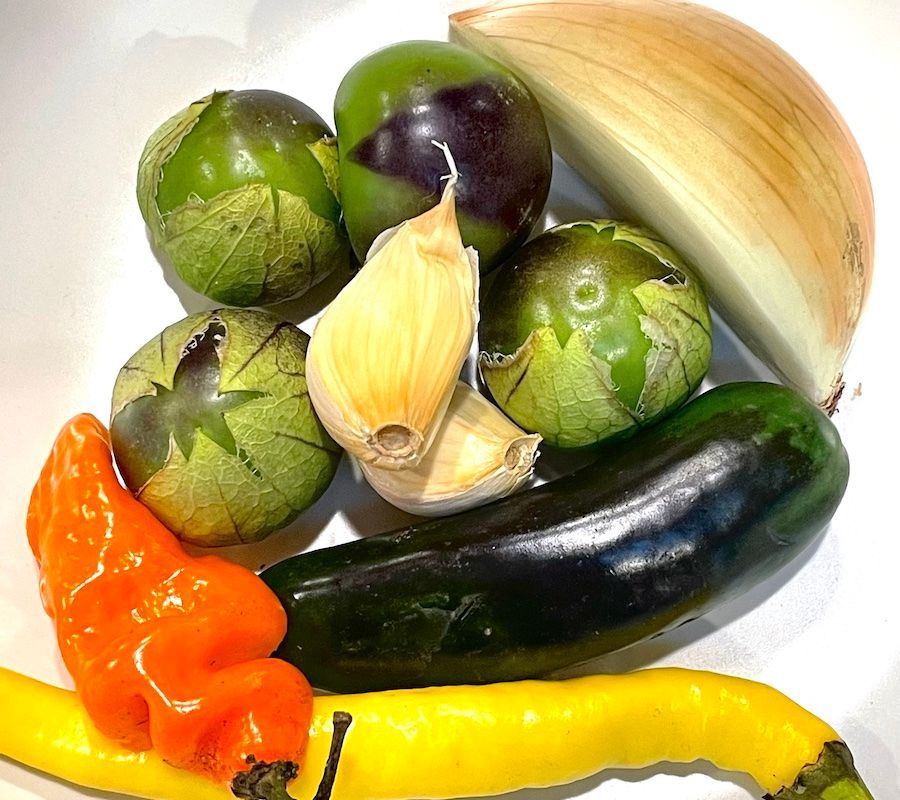 This is medium hot, salsa made from our tomatillos, peppers of various kinds, garlic, and onions. Check out the picture. This salsa is canned and need not be refrigerated.
