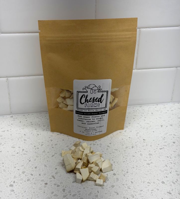 Add umami flavor and substance to your dishes. Try using Freeze Dried Royal Trumpet Mushroom Pieces in place of tofu in dishes. These packages are made in small batches, supply is limited. Grown by Chesed Farms, and freeze dried, and packed by All Things Artisan. Freeze-Dried Royal Trumpet Mushroom Pieces come in 0.5 oz packages Purchase options include: single pack option, 3-pack option or 5-pack option Home Delivery & Pick Up Location Schedule: College Place - Same Day Delivery* Walla Walla Southgate - Same Day Delivery* Walla Walla Eastgate - Same Day Delivery* Milton Freewater - Thursdays Waitsburg & Dayton - Thursdays For Tri-Cities delivery, please Visit Walla Walla Food Hub to order: https://www.wallawallafoodhub.com/Products?search=Chesed *Same day delivery available for College Place & Walla Walla when you order by 1:00 p.m. View all delivery and pick up locations when you add items to your cart. Check your delivery area here: https://images.squarespace-cdn.com/content/v1/618d4e2870670519781323fb/7c6ec56d-613e-4f20-9c68-5c2a200b7954/Delivery+Map.jpg?format=1500w
