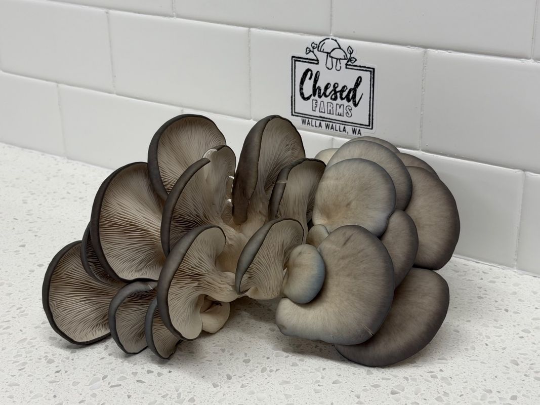 Fresh, farm-grown blue oyster mushrooms. Wonderful earthy taste. Blue oyster mushrooms have a unique mild flavor and texture profile that is sweet and meaty with hints of licorice. Perfect for braising, sautéing, roasting, frying, grilling, and stir-frying. Home Delivery & Pick Up Location Schedule: College Place - Same Day Delivery* Walla Walla Southgate - Same Day Delivery* Walla Walla Eastgate - Same Day Delivery* Milton Freewater - Thursdays Waitsburg & Dayton - Thursdays For Tri-Cities delivery, please Visit Walla Walla Food Hub to order: https://www.wallawallafoodhub.com/Products?search=Chesed *Same day delivery available for College Place & Walla Walla when you order by 1:00 p.m. View all delivery and pick up locations when you add items to your cart. Check your delivery area here: https://images.squarespace-cdn.com/content/v1/618d4e2870670519781323fb/7c6ec56d-613e-4f20-9c68-5c2a200b7954/Delivery+Map.jpg?format=1500w