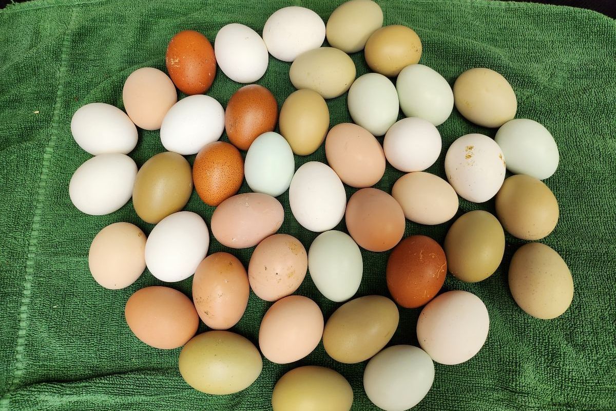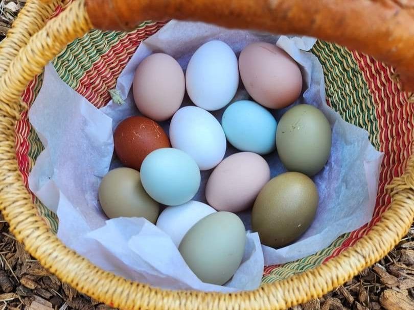 1 dozen chicken eggs laid by our pasture-raised girls. Colors and sizes vary.