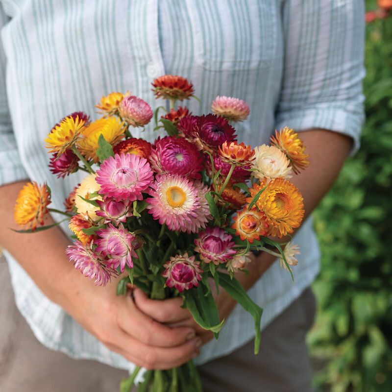 "New! Well-balanced mix of colors. Choice Mix includes varying hues of gold, orange, peach, pink, purple, raspberry, and red. Well-branched plants. Use for fresh-cut or dried flowers. Double blooms are 2–2 1/2" across. Also known as bracted strawflower."- Johnnys