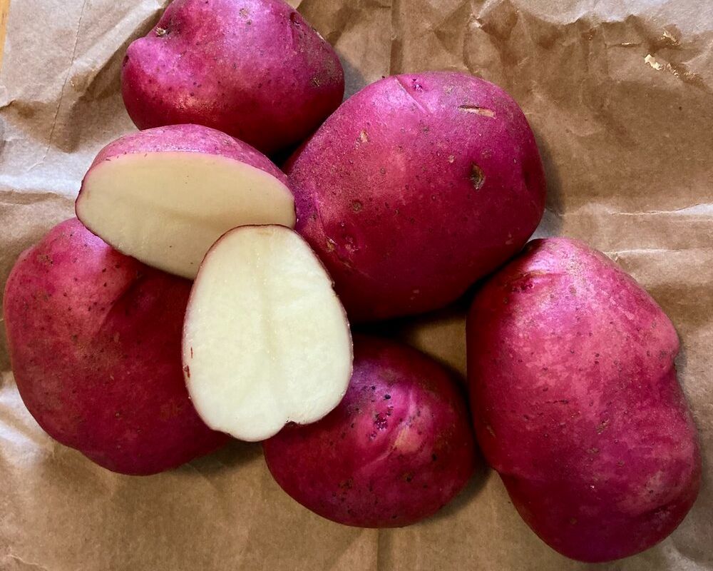 Adirondack Red - all red (red flesh, red skin) that is an early-mid season, high-yielding variety, very high in antioxidants. It has moderate resistance to scab and can be susceptible to silver scurf. It is considered a specialty variety.