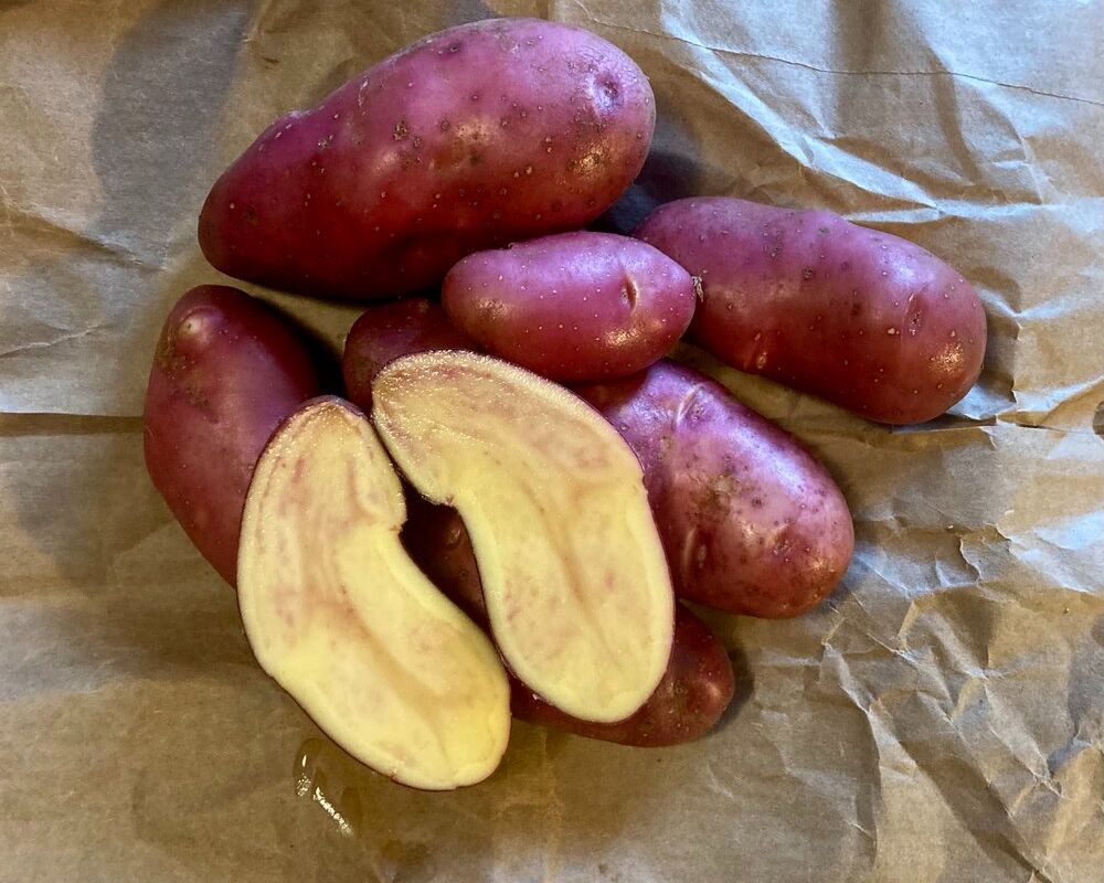 French Fingerling - Creamy and delicious, pink skin with yellow flesh speckled with pink; resistant to