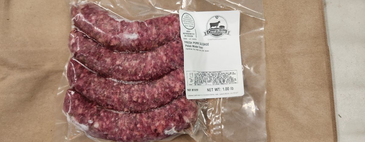 Crest Point Farms fresh dark brown Butifara Sausage is produced from the ancient heritage New Zealand Kunekune pig. The sausage ingredients are pork, garlic powder, salt, spices, and paprika. Pigs are born and raised on our farm, fed with grass, to achieve high nutrient density, accounting for its very dark brown coloring, and supplemented with veggies, fruits, and acorns. The pigs graze out on pasture right with our cattle. No hormones, no vaccines, no antibiotics, no growth hormones are ever used. Pigs are humanely harvested using a small pork USDA facility that allows us to personally transport them and place them in their own private pin to closely match an on-farm harvest. We have selected a butcher that uses no nitrates and no nitrides. Each package contains 4 sausage links.