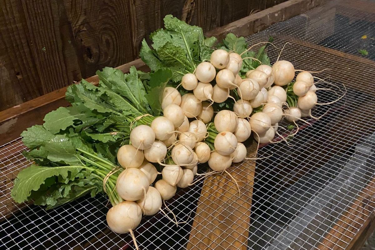 Small sweet turnips generally enjoyed raw. Greens are also edible as a salad green or cooked.