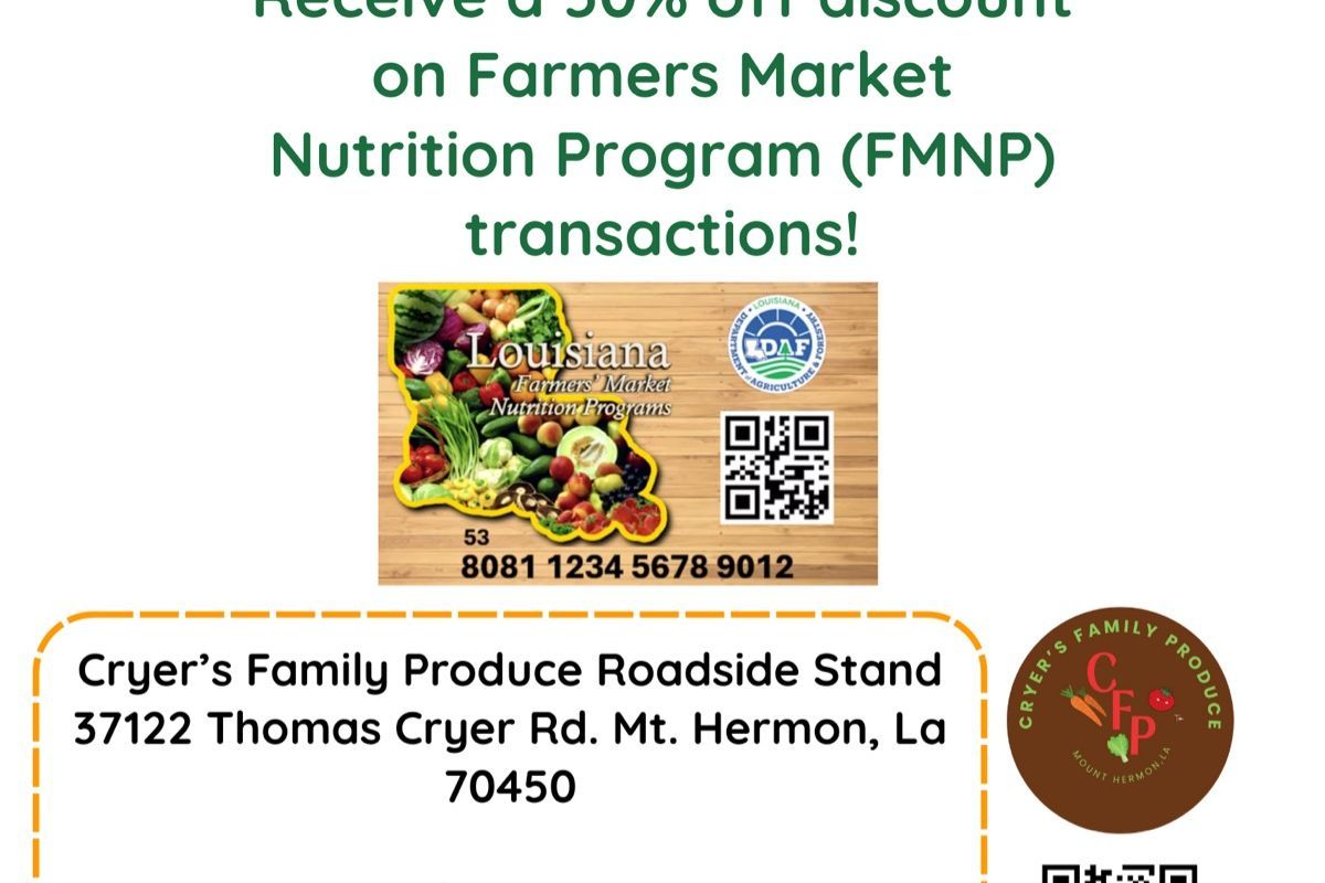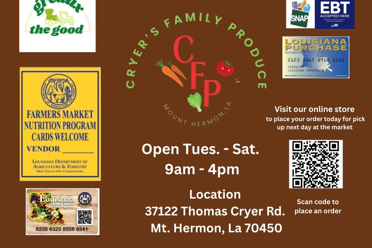 We are Family Owned and have catered to our community over 50 years right here in Mt. Hermon, Louisiana. We produce many varieties of fruits and vegetables grown in Zone 8 such as, watermelon, okra, greens, beans, squash, tomatoes, potatoes, eggplant, cantaloupe, cucumbers, asian pears, lemons, blueberries, plums and more. We create a variety of products such as; medicinal herbs, cottage foods, elixirs, boiled & roasted peanuts, honeys, natural juices, pies, pecan candies, etc. Our Farm Membership (CSA) is purchased online and picked up Tuesdays 3-6pm at the roadside stand in Mount Hermon. At the current time you also have the option of coming directly to the roadside stand Tuesday thru Saturday 9a-4p and purchasing anything we have available. On this website we are ONLY offering our FARM SHARE which is our FARM Membership .