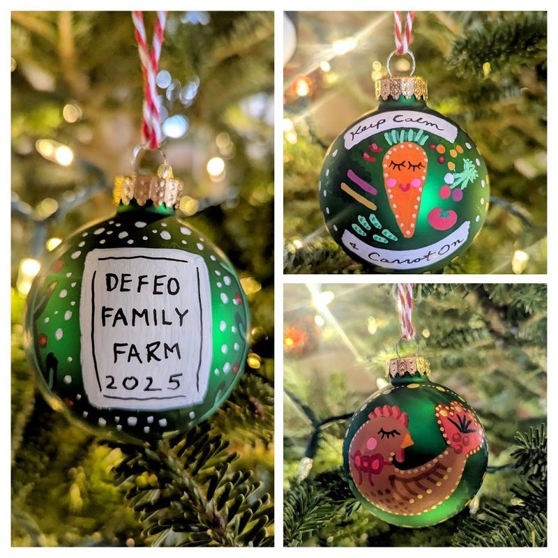 Laura has made two ornaments that we are now offering in our store to celebrate the close of the 2025 season. We also hope to use a portion of the proceeds to help expand our participation in community food programs with Frederick Health, Farm to School Frederick, and other initiatives - so we can continue working to ensure that food-insecure community members have access to local, organic produce. This year’s bulbs include the “Keep Calm and Carrot On” slogan Laura penned for a past blog post when we began harvesting our fall carrots. We also have a chicken bulb to honor the hard work of our laying hens this year. Each bulb is hand-painted on both the front and back