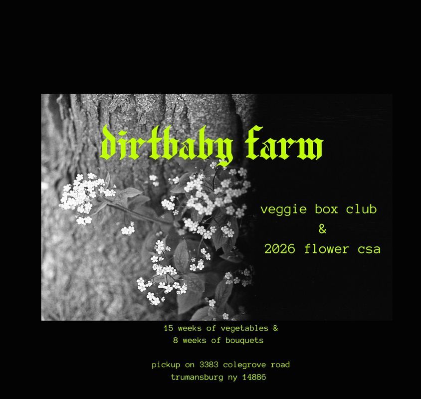Pick-up is on Wednesdays from 5-7 at 3383 Colegrove Rd Trumansburg, NY 14886. Please head to our website for more info or email us at dirtbabyherbsandflowers@gmail.com