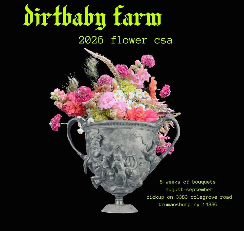 Pick-up is on Wednesdays from 5-7 at 3383 Colegrove Rd Trumansburg, NY 14886. Please head to our website for more info or email us at dirtbabyherbsandflowers@gmail.com