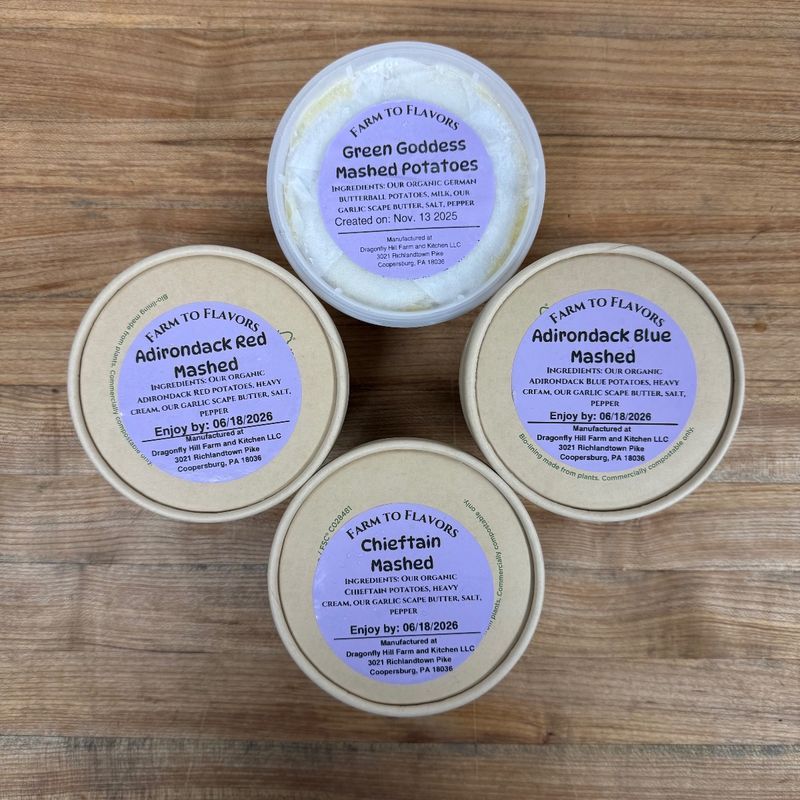 Our organic potatoes, our garlic scape butter, heavy cream, salt, pepper. We grow Adironack Red, Adironack Blue and Chieftain Potatoes.