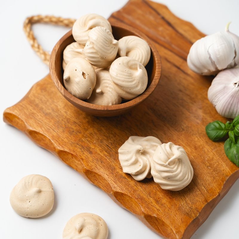 This smooth black garlic purée is carefully folded into delicate meringue, creating airy bites with a subtle sweetness and a surprising depth of flavor. The result is a crisp, melt-in-your-mouth treat that balances light sweetness with the complex, savory character of black garlic.