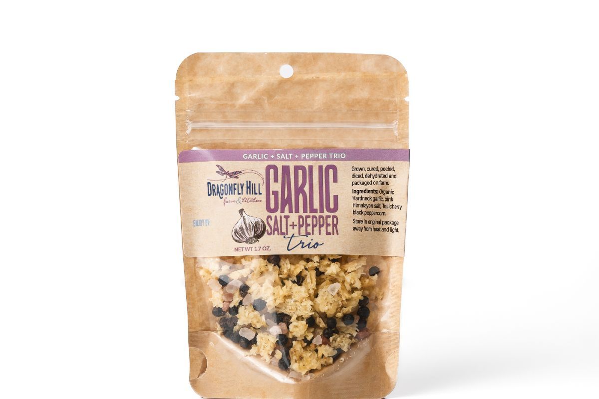 The TRIO – Dehydrated Diced Garlic, Himalayan Salt & Tellicherry Black Peppercorn Our TRIO blend is a bold and versatile seasoning crafted from the finest ingredients. Featuring our Organic, Heirloom, Hard-Neck Garlic, carefully dehydrated for a rich, aromatic flavor, this mix is perfectly balanced with pure Himalayan Salt and robust Tellicherry Black Peppercorns for a gourmet seasoning experience. Packaged in a spice jar with a built-in grinder top, it allows you to freshly grind the perfect blend of garlic, salt, and pepper with ease. For sustainability, we offer refill bags, so you can continue using your grinder jar while reducing waste. Ideal for seasoning meats, vegetables, pasta, eggs, and more—this all-in-one blend simplifies cooking while delivering exceptional farm-fresh flavor. Freshly Ground. Boldly Balanced. Sustainably Crafted.