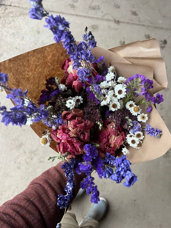 Enjoy everlasting beauty with our dried flower bouquets! We have been preserving our blooms since the Spring, so you can enjoy peonies, roses, and lisianthus year round! These bouquets will last years, but will dull in color with exposure to the sun, so they are best displayed in an area away from windows.