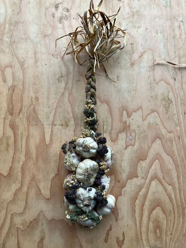 Beautiful garlic braids with dried flowers designed by Farmer Beth!