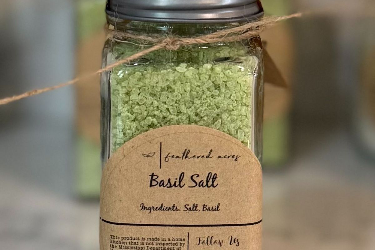 Basil salt made with farm grown Sweet Basil and Course Sea Salt. Perfect for fresh veges, pasta, sauces, and soups.