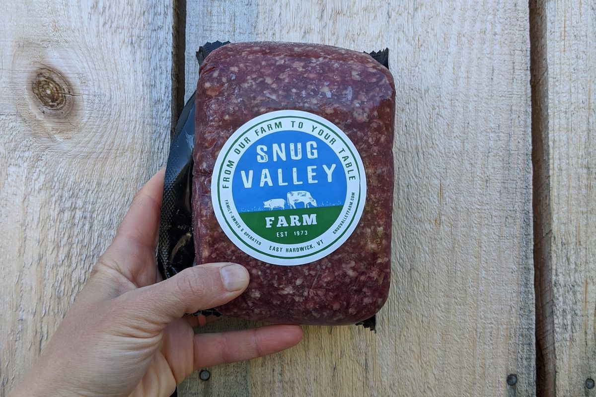 Ground beef from Snug Valley Farm. Frozen. Each package is 1.2 - 1.3 lbs. From Snug Valley: We here at Snug Valley Farm focus on utilizing our natural grasses here on the farm to the highest potential. To do this, our beef are moved to fresh grass every day, all grazing season long. By moving beef to fresh grass each day, we allow the animals to have a positive impact on the grass and soil. With daily moves of the herd, the grass and has at least 30 days of rest before it gets grazed again, providing the time for the plant to regrow and restock itself with nutrients. We buy our young beef animals from producers that share our philosophy and commitment to grass-fed beef. Our focus is on genetics that predisposes the beef animal to be successful on a full diet of grass and forage, producing the most tender, flavorful, and well-marbled meat possible.