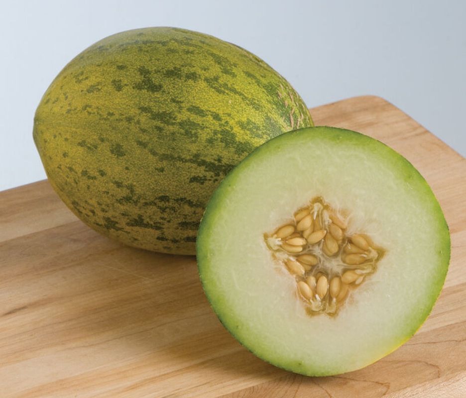 An early-ripening Piel de Sapo, and a farm favorite! Medium-small oval fruits that ripen to a bright yellow with green mottling. Sweet, aromatic white flesh. Harvest when fruit turns a full deep yellow and should slip off the vine. **All plants are for pick-up during our Spring Planting Festival at the farm on Saturday 05/09. We will be offering delivery options for an additional fee. You will receive an email at a later date to select whether you'd like to pick-up or pay for delivery.