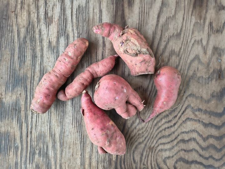 We're not going to lie, these don't look like perfect supermarket sweet potatoes. These tropical vegetables are difficult to grow in our climate, and even more so when surrounded by hungry rodents who know where the sweetness is. Nonetheless, you'll find them to be as creamy and sweet as any sweet potatoes, and we're proud to offer them to you!