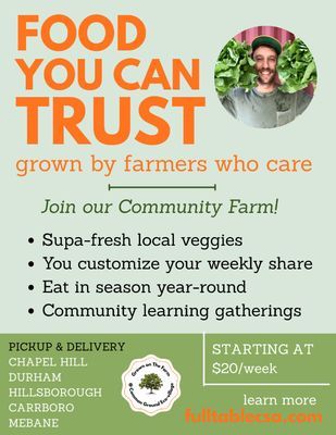 Invitations to special events on the farm designed for all ages such as community harvest days (sweet potatoes!), farm to fork meals weekly (weekly farm lunches and montly farm dinners!), abundance processing days (tomato sauce!), and educational events (land-tending skills!)