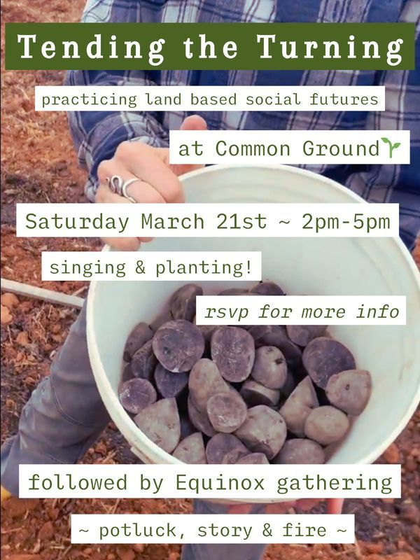 What wild times these are! Let's get together and tend the earth and witness the changing of the seasons. Come join us as we seek just social futures, whispered from the land. Saturday, March 21st, we will be planting potatoes and singing, from 2-5:30 pm followed by a pot-luck, equinox story, and fire.