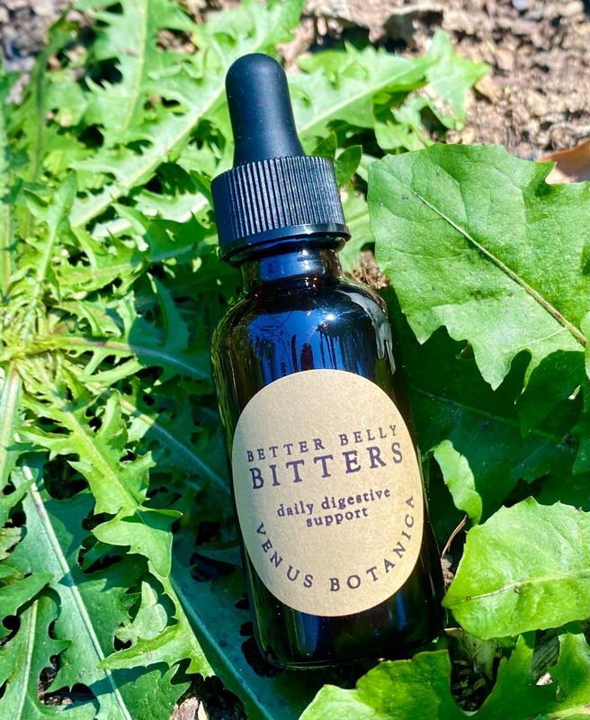 Bitters for better health vitality! This is an herbal tincture formula. Relieves gas, bloating + heartburn, blood sugar balancing, supports liver + skin health, a healthy stress response + so much more! ingredients: burdock root (arcticum lappa), dandelion root (taraxicum offinale), angelica root (angelica archangelica), wood betony (stachys betonica), orange peel (citrus sinensis), + fennel seed (foeniculum vulgare)