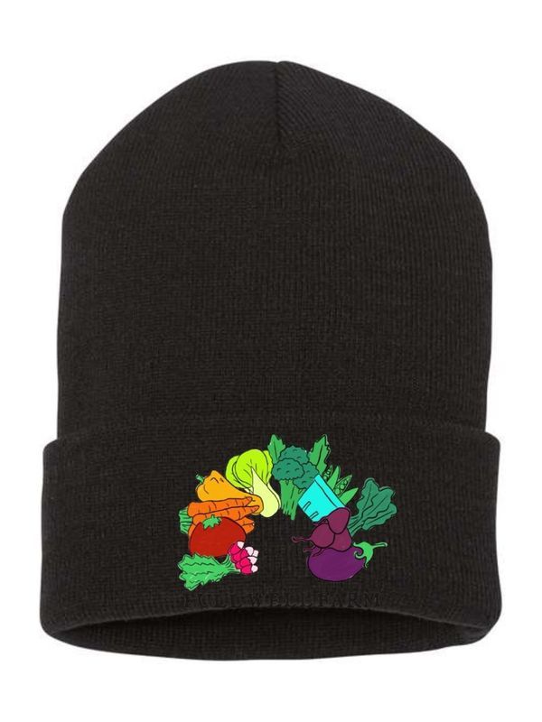 A black beanie with FWF vegetable rainbow, perfect for the holidays!