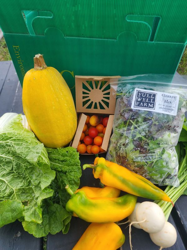 You asked for flexibility about what comes in your box ... so we answered! Now introducing Full Well Farm Customizable Vegetable CSAs. Each week, members will choose from the wide selection of vegetables that we and other local farmers grow. There's something new with each season - from spring greens and herbs to over 40 varieties of summer tomatoes and peppers and concluding with sweet fall root vegetables and hearty greens. Customizing each week is an easy three-step process: First, we create a "default" box with suggested items. Second, you customize your box, choosing to add or remove items, or leave the default as it is. And third, we pack and deliver your box to your pickup location! You can even set up season-long "rules" if you have preferences that will never change, like having an allergy to a group of crops or always wanting larger quantities. Read more here: https://www.fullwellfarm.com/csa The Full Vegetable CSA Share runs for 23 weeks from mid-May through October. Members can also select the Biweekly pickup option (12 pickups total), which we recommend for smaller household sizes. Despite our best efforts, farming doesn't come with guarantees, so if the farm experiences a crop loss, what is available to members might change. Luckily, we also work with other local producers to supplement the crops we grow, including sweet corn, winter squash, and more! Returning members, use code "RETURNING26" at checkout and get a free week in 2026! Being a CSA member means being part of our farm community. Every week, members will receive an email about what vegetables are coming into season that week, ideal recipes, storage tips, and pictures and updates from our farm crew. Please review our Vegetable CSA page before purchasing a CSA to make sure that you have all of the information you need before registering. This page includes suggestions for how to use the sliding scale payment system: https://www.fullwellfarm.com/csa A 4.9% service fee is added automatically to any online payment option. This fee is removed if you pay offline, and reduced to 2.9% if you pay with a bank account instead of a credit card. Offline payments can be made by SNAP, check, or BerkShares. Checks can be sent to Full Well Farm at 313 East Road Apt A, Adams, MA 01220. In an effort to make our CSAs more affordable, we also now offer the option to pay for Vegetable CSA Shares monthly after paying a deposit. Lastly, our community partner Hoosac Harvest offers subsidized shares that cost LESS than the lower-income price point for qualifying members. SNAP members and Hoosac Harvest members are not required to pay anything at the time of registration. We will reach out to members who select this option after registration. You can read more about these payment options here: https://www.fullwellfarm.com/pricing-payment-options