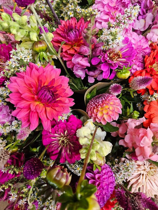 Berkshire-grown flowers like you've never seen them before! More info on gifting below. Long-lasting blooms that will fill your home with color all summer long. Flowers in September include a focus on our beautiful dahlia collection, marigolds, sunflowers, zinnias, snapdragons, cosmos, celosia, amaranth, gomphrena, rudbeckia, and more! A Full Well Farm Flower Club works like a bouquet subscription: sign up in advance and pick up a florist-quality bouquet every week from the farm or a convenient pickup location. A Flower Bouquet CSA is the best way to guarantee fresh, organically grown, local flowers for you or your loved one all season. You will be wowed by the colorful, diverse blooms, and the vase life of flowers grown right here on the farm in Adams.