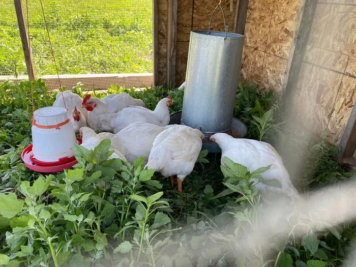 We keep around 50-75 chickens in a covered and secure pens up to 200 square feet. We move them every day or two, depending on what the ground is like where they are. Our chickens are a patented "jumbo broiler" from Sunnyside Hatchery in Beaver Dam WI, and are similar to the hybrid known as "Cornish Cross" but alert and agile than any CornishX from other hatcheries we've tried. They simply have great genetics - no health problems, put on thick fatty skin, and juicy breasts and legs!