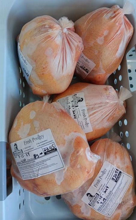 Finished chickens range from 3 to 6 lbs, and cost $16 to $33 each. They come plucked, cleaned, whole with neck inside the cavity, vacuum-sealed and frozen - unless otherwise requested as fresh (raw and chilled), and only within a week of processing. They are safely and humanely processed on our farm under the P.L. 90-492 Producers/Grower Exemption.