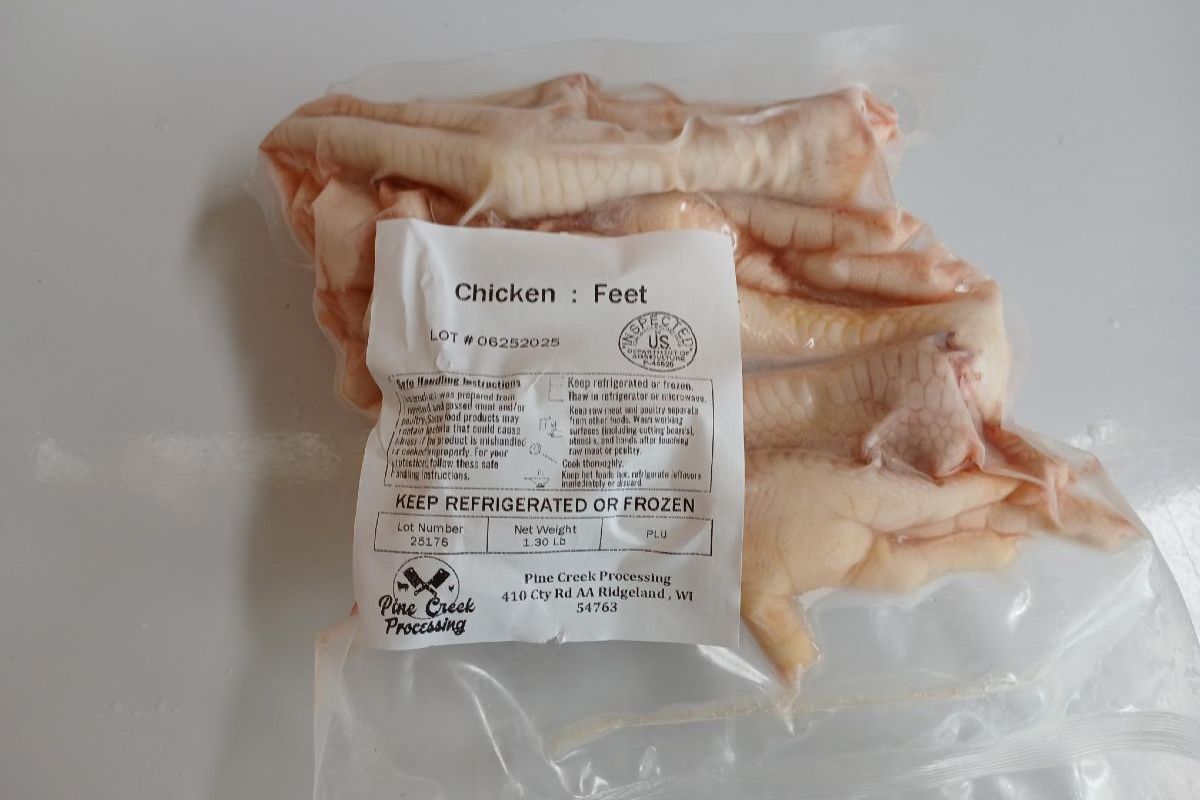 Our chicken feet come from our pastured chickens, who eat only grass, bugs, organic sprouted oats, and a 20% protein organic grain mix (contains certified organic wheat, soy, corn, alfalfa, and sunflower seeds). Packages weigh between 1.5 and 2 lbs each. The cost is $6.00 per pound. Please order the number of packages you want here, and I will select the package(s) to bill you for exact weight and cost.